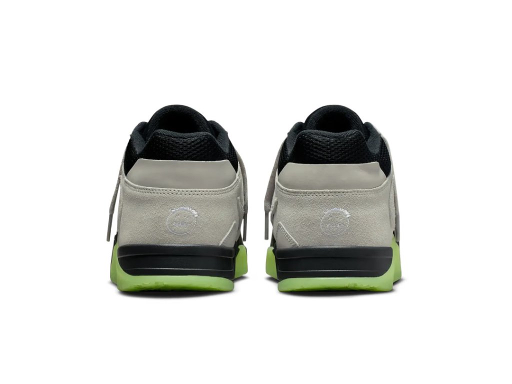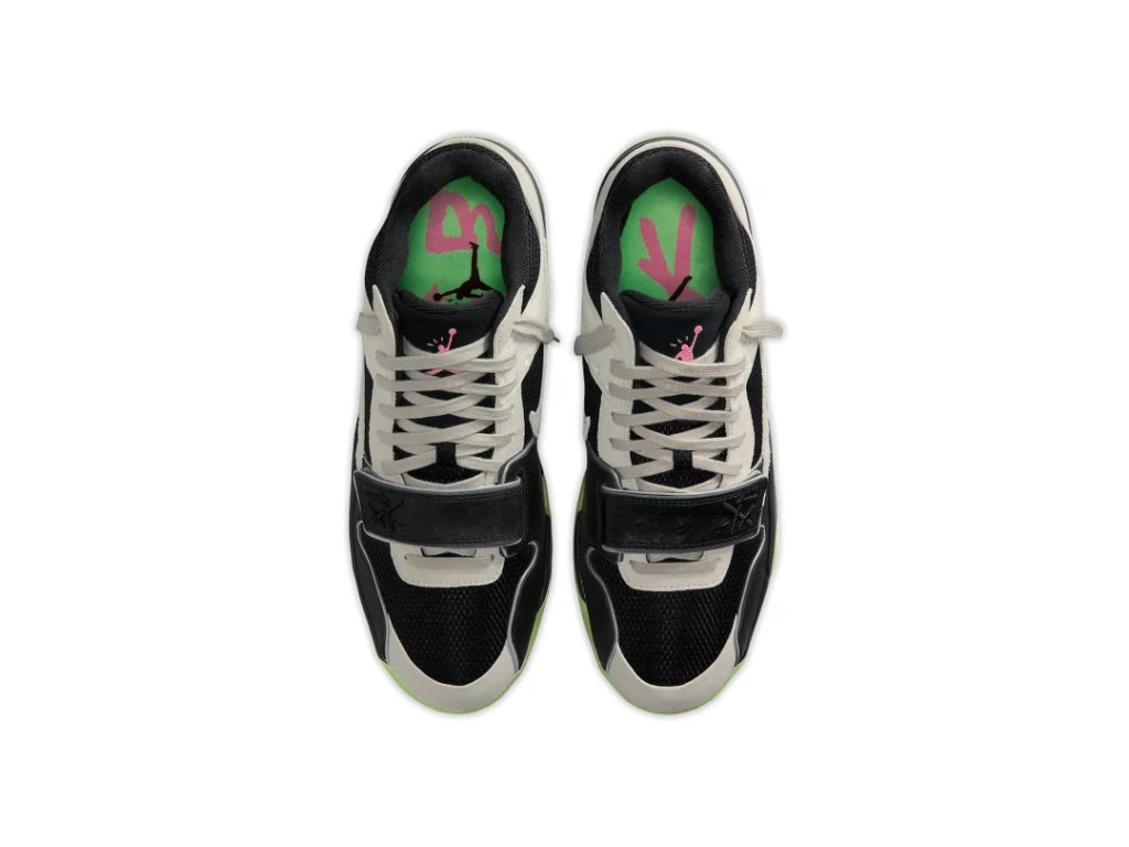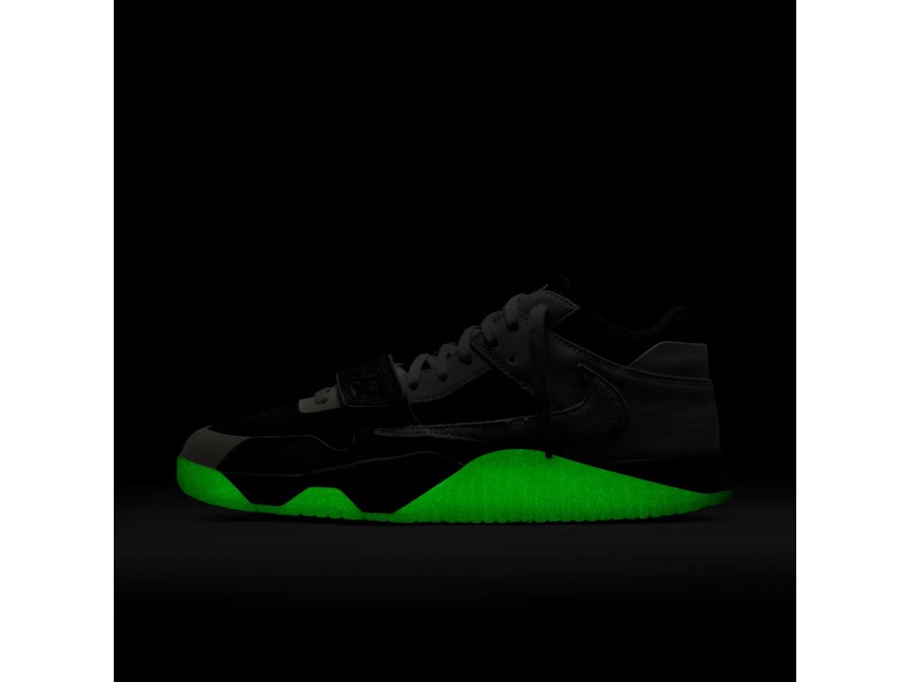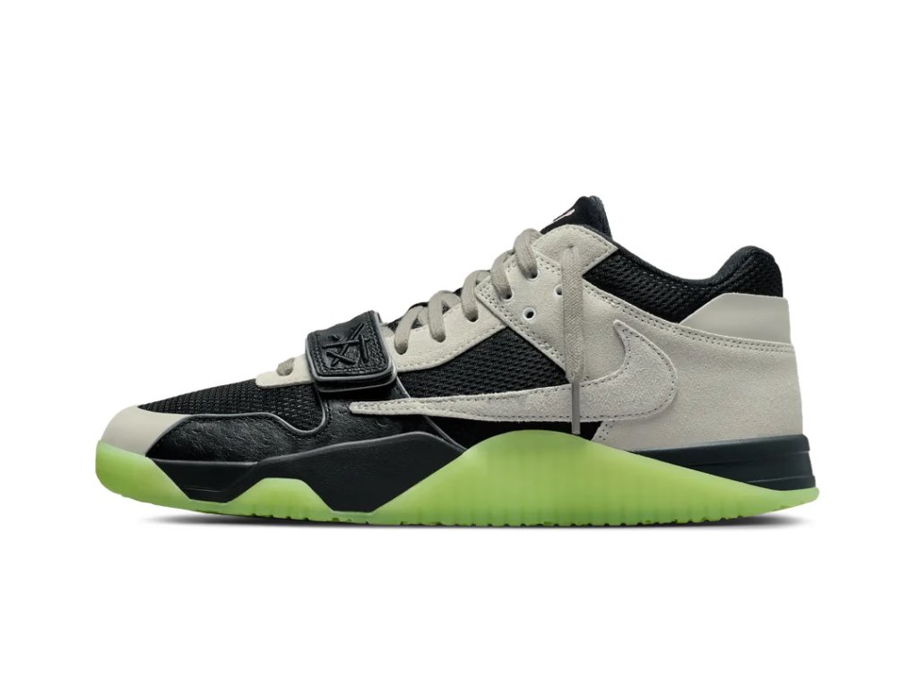 Svršek je tvořen kombinací prémiového canvasu a nubuku, což zajišťuje odolnost a pohodlí při každodenním nošení. Dominantním prvkem je nastavitelný strap přes nárt pro lepší fixaci a individuální fit. Charakteristický obrácený Swoosh na vnější straně zůstává věrný Travisově signature stylu, zatímco Jumpman logo a Cactus Jack branding dotvářejí celkový look.